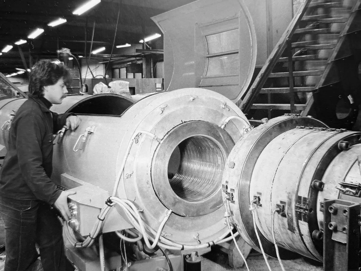 Den første store produktionslinje hos Hallingplast i 1987.